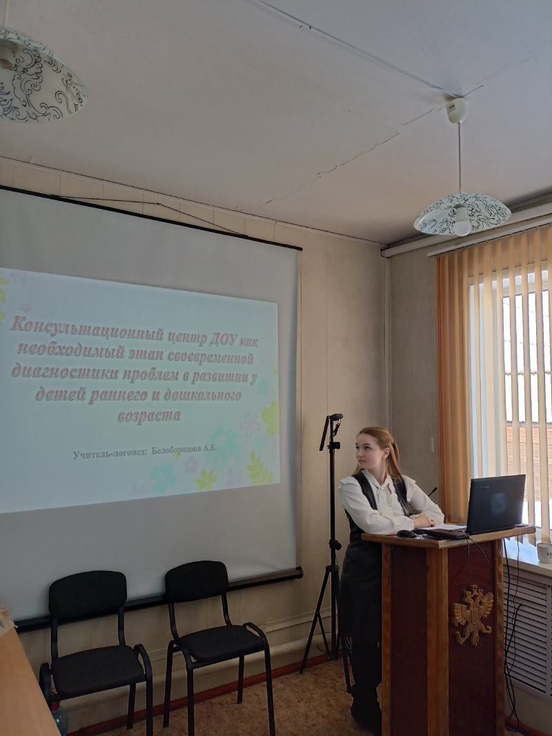 Учитель- логопед МБДОУ " Олонский д/с" Белобородова А.Е.презентовала опыт работы Консультационного Центра ДОУ как необходимого этапа современной диагностики проблем в развитии у детей раннего и дошкольного возраста.